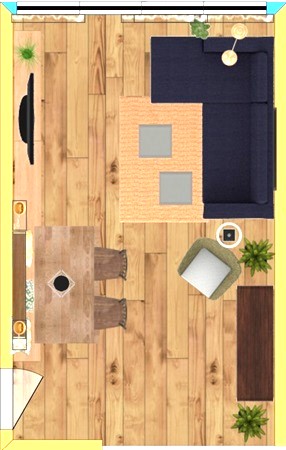 Die Visualisierungen zeigen das geplante Farb- und Einrichtungskonzept sowie die neue Möbelanordnung, erstellt mit einem 3D-Raumplanungstool. In der Realität wird ein warmer, sonniger Gelbton eingesetzt, der dem Raum eine freundliche, fast mediterrane Atmosphäre verleiht.